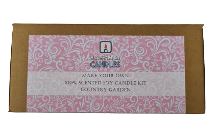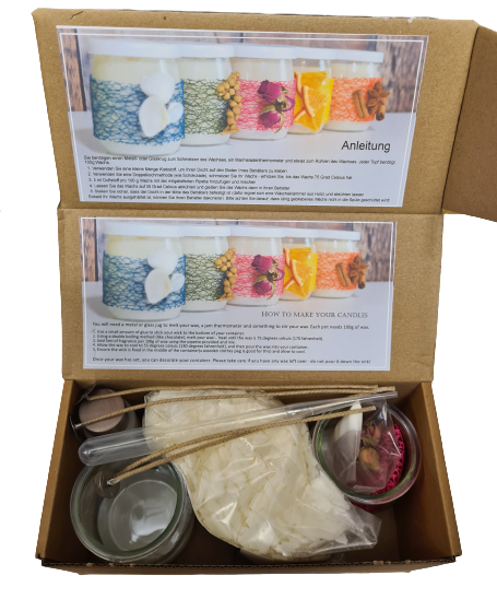 Do-it-yourself scented candle set. Included are all the ingredients (wick, wax, scented oil, petals) to make your own scented candle. Three different fragrances are available.