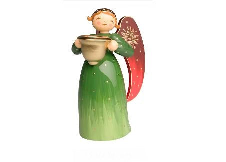 Richly Painted Angel, green, with candle holder.
