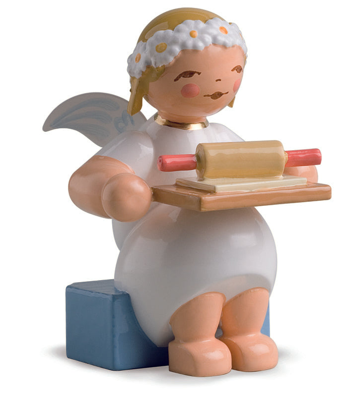 Marguerite angel, sitting, with rolling pin and cookie dough.