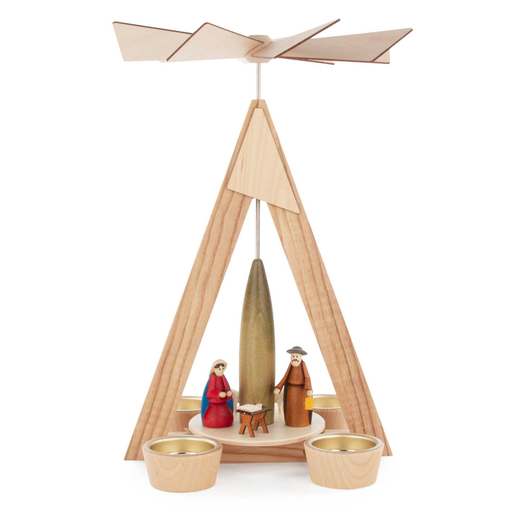 Diese moderne Weihnachtspyramide ist aus hellem Holz gefertigt und zeigt auf der Laufscheibe die heilige Familie und zwei Schafe. Angetrieben wird sie durch vier Teelichte und schafft so eine gemütliche Atmosphäre in Ihrem Zuhause. Die klare, moderne Form und das helle Holz machen sie zu einem zeitlosen Klassiker, der in jedem Wohnzimmer eine gute Figur macht. Die Laufscheibe zeigt die heilige Familie und zwei Schafe, die durch das warme Licht der Teelichte zum Leben erweckt werden. Die Pyramide wird in Handarbeit im Erzgebirge hergestellt und steht somit für höchste Qualität und Tradition.