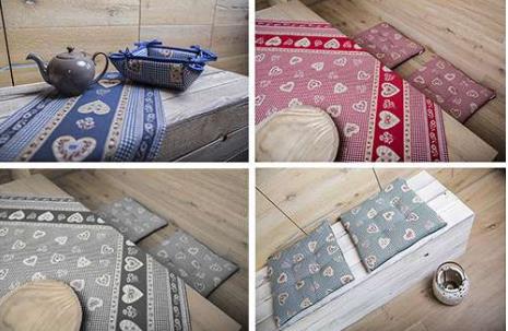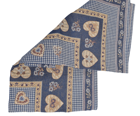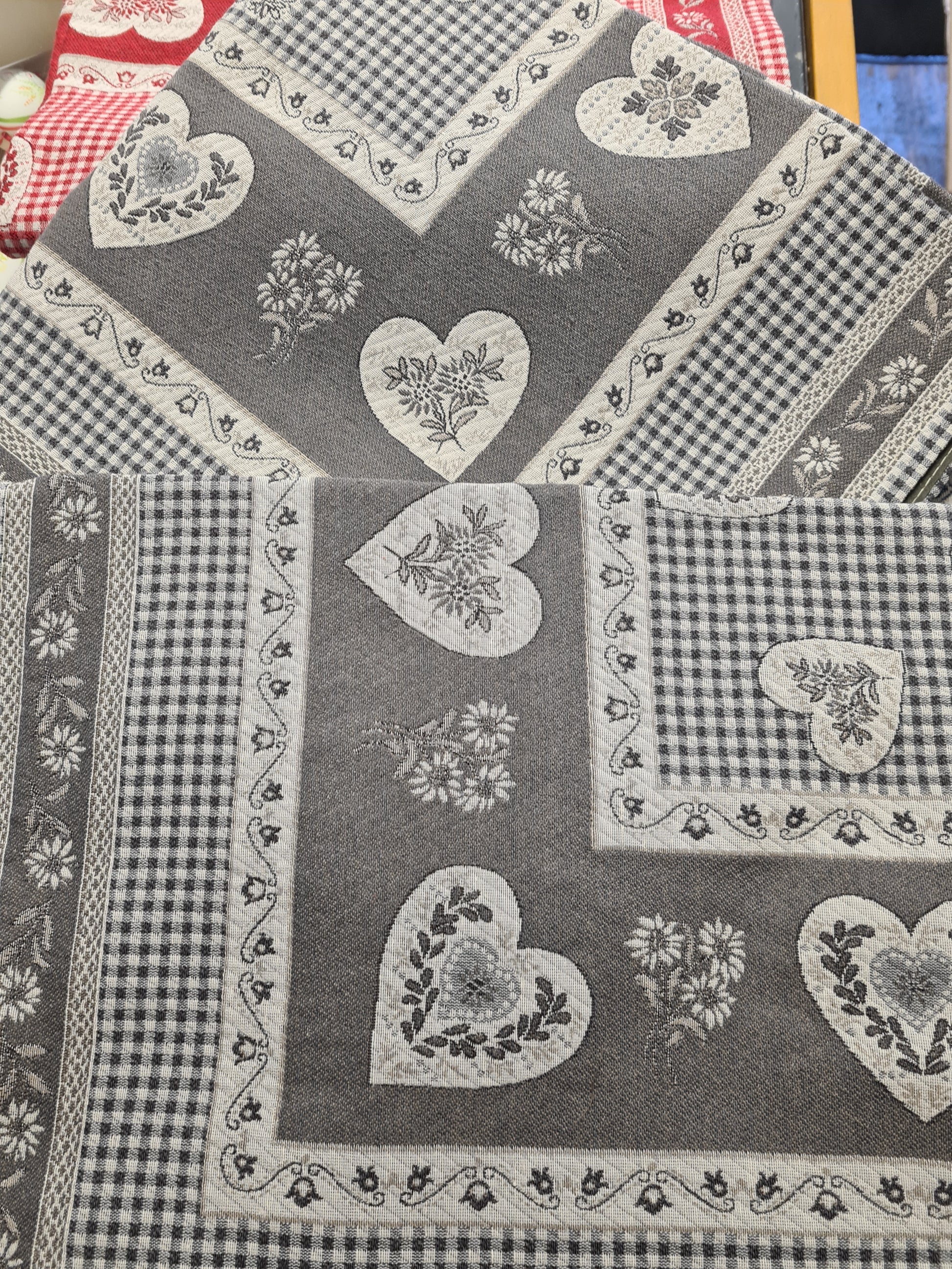 Nappe de haute qualité avec décor edelweiss et cœurs en rouge, bleu ou vert riche.